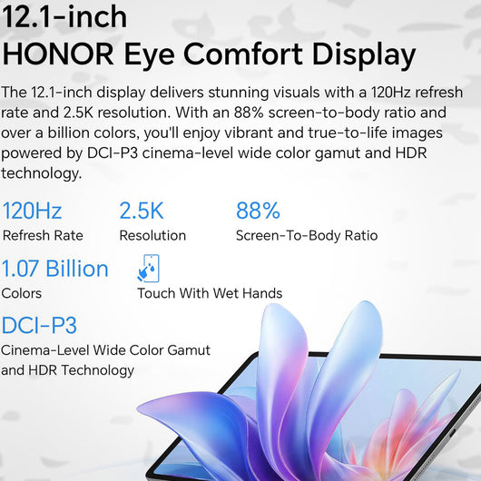 - 12.1-inch HONOR Eye Comfort Display: The 12.1-inch display delivers stunning visuals with a 120Hz refresh rate and 2.5K resolution. With an 88% screen-to-body ratio and over a billion colors, you'll enjoy vibrant and true-to-life images powered by DCI-P3 cinema-level wide color gamut and HDR technology.